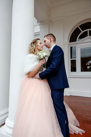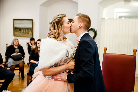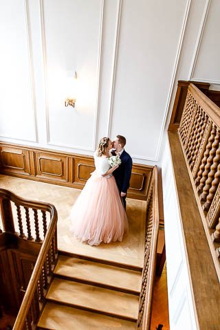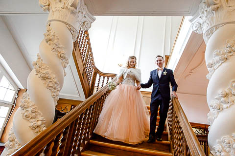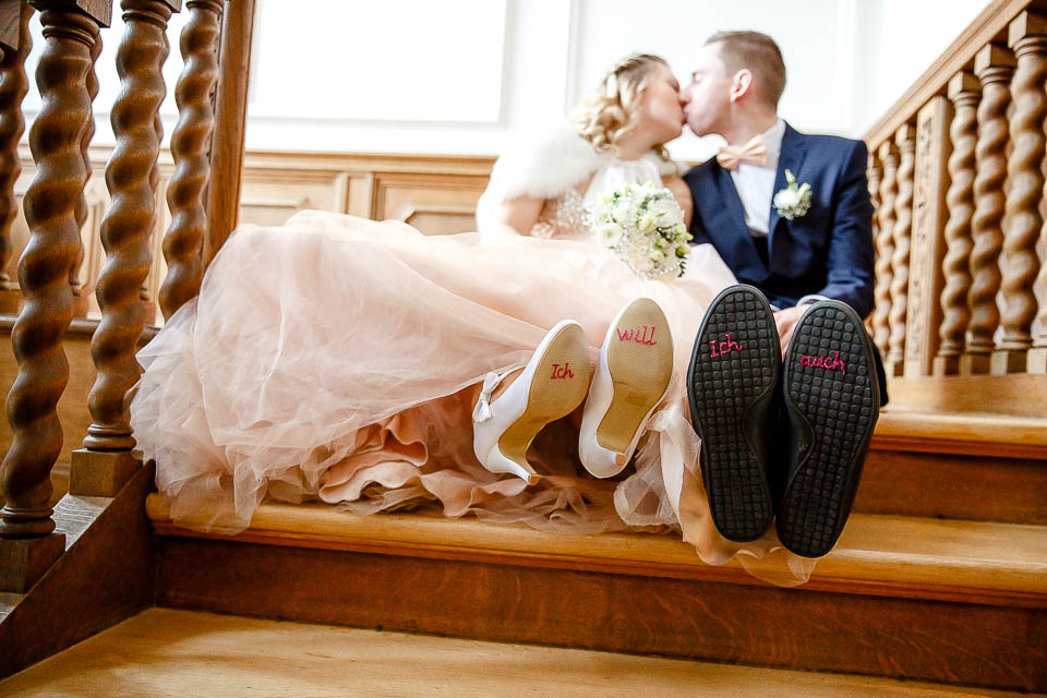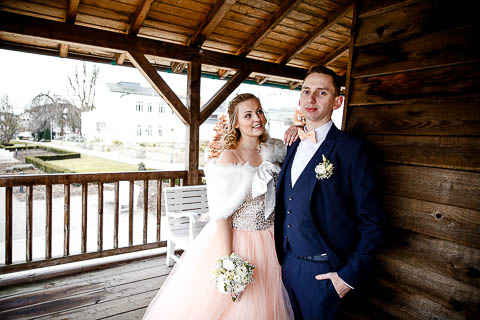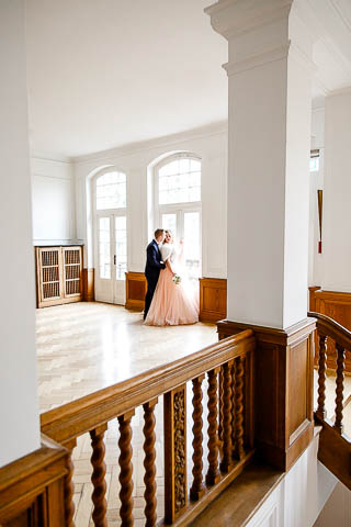 Da der Hochzeitstermin auf Februar angesetzt war, war wegen der Kälte naheliegend, dass das Brautpaarshooting am besten indoor stattfindet. So habe ich in der Musikschule angefragt, ob wir die Brautpaarfotos dort in dem schönen Gebäude machen dürfen. So konnten wir dort sehr lockere und entspannte Fotos machen. Wir ließen uns natürlich auch nicht nehmen, anschließend paar schöne Aufnahmen im Bad Salzufler Stadtpark an den Salinen zu machen – dem Wahrzeichen des Ortes.
